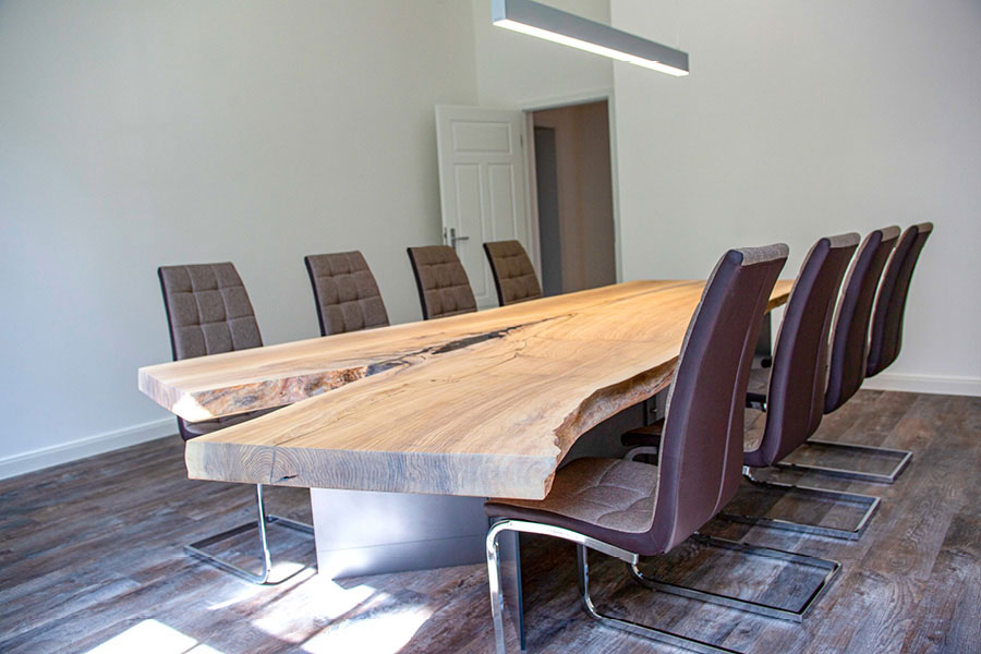 Mit verschiedenen Veredelungs- und Bearbeitungstechniken setzen wir die Struktur des Holzes richtig in Szene. Zum Beispiel in Form einer Kombination mit in die Tischplatte integrierter Beleuchtung. Derartige Esstische bereichern das Ambiente beim geselligen Zusammensein und drängen sich dank der Natürlichkeit nicht zu sehr in den Vordergrund.