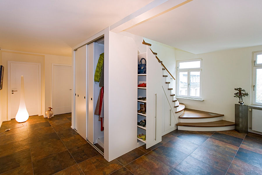In vielen Häusern und Wohnungen ist der Platz in der Diele oder im Flur begrenzt. Dem entgegnen wir mit pfiffigen und kreativen Ideen aus Holz. Vor allem Nischen eignen sich hervorragend für einen Einbauschrank nach Maß, zum Beispiel der Platz unterhalb der Treppe kann in wertvollen Stauraum umgewandelt werden.