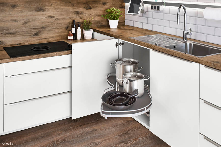 In kleinen, verwinkelten Räumen wird gerne der Eckschrank mit Drehkarussell eingesetzt. Darin lassen sich vor allem Töpfe und Pfannen hervorragend verstauen und sehr gut erreichen. Die perfekte Lösung für schwer zugängliche Bereiche.