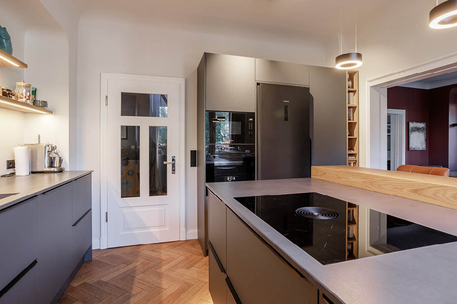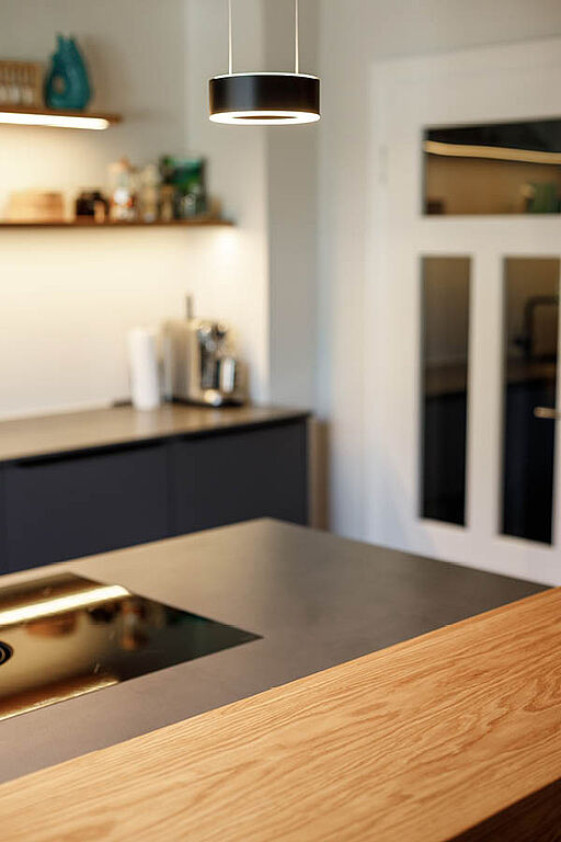 In dieser Küche sind die Wege klar und die Aufgaben gut verteilt. Auf der einen Seite liegt die ruhige Arbeitsstrecke mit viel Fläche zum Vorbereiten. Gegenüber sitzt die Kochzone mit modernster Koch- und Abzugstechnik der Marke BORA, sodass Kochen und Vorbereiten parallel laufen können, ohne dass man sich gegenseitig blockiert. Die Sitztheke markiert den Übergang zum Wohnbereich und sorgt dafür, dass man beim Kochen Gesellschaft haben kann, ohne dass es eng wird.