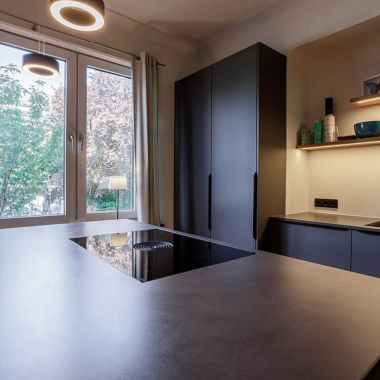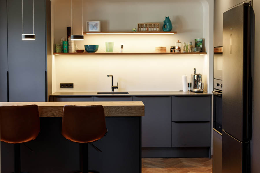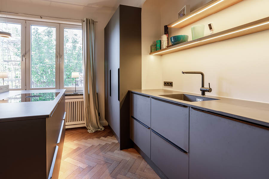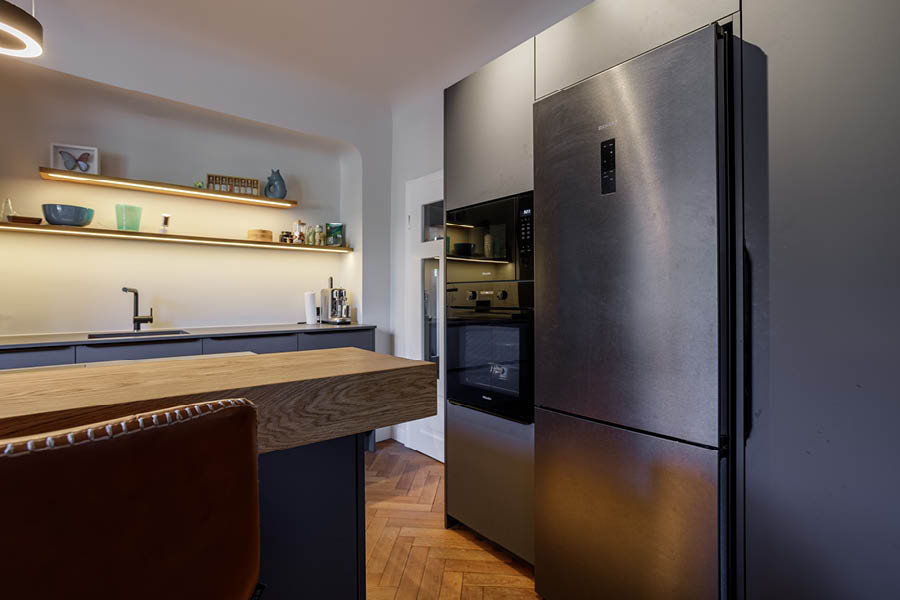 Ein schönes Detail in diesem Projekt ist das Lichtkonzept: indirekte LED-Beleuchtung bringt Tiefe in die Nische und setzt die offenen Regale sowie den Küchenblock subtil in Szene. Abends wirkt das Licht weich und wohnlich. Die Arbeitsbereiche bleiben dennoch klar ausgeleuchtet. Genau solche Details entscheiden am Ende darüber, ob eine Küche nur „gut aussieht“ oder sich jeden Tag gut anfühlt.
