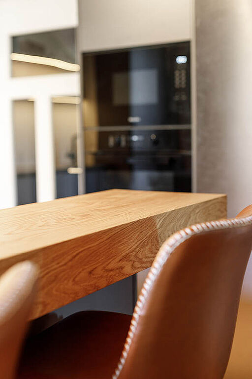 Die Sitztheke ist der Platz, an dem man kurz landet und oft länger bleibt. Ein Kaffee am Morgen, ein Gespräch zwischendurch, ein Glas Wein am Abend. Mit den zwei Barhockern und dem massiven Holzaufsatz ist sie schnell der Lieblingsplatz, ohne die Arbeitsfläche in der modernen und durchdachten Einbauküche zu blockieren. So bleibt man beim Kochen in Kontakt, aber die Abläufe laufen weiter entspannt.