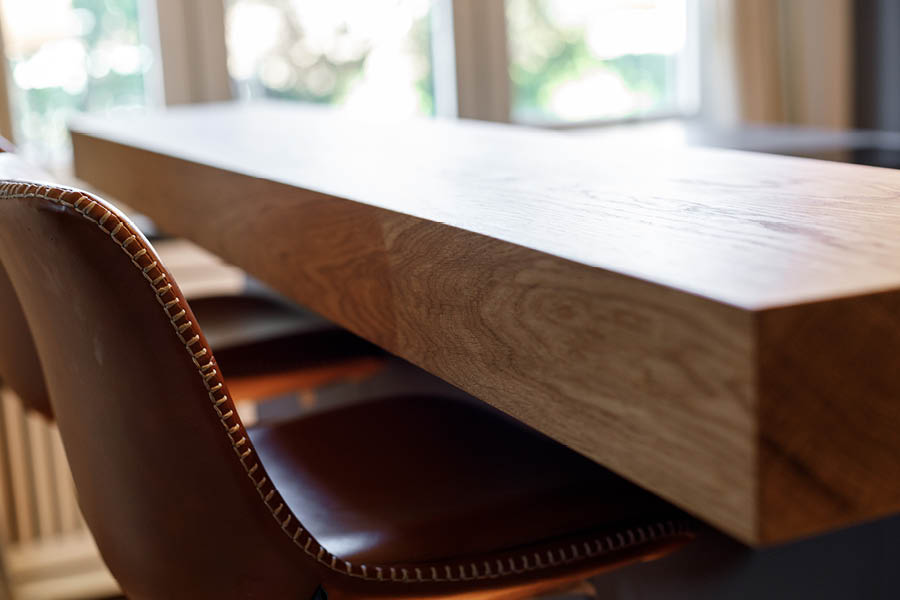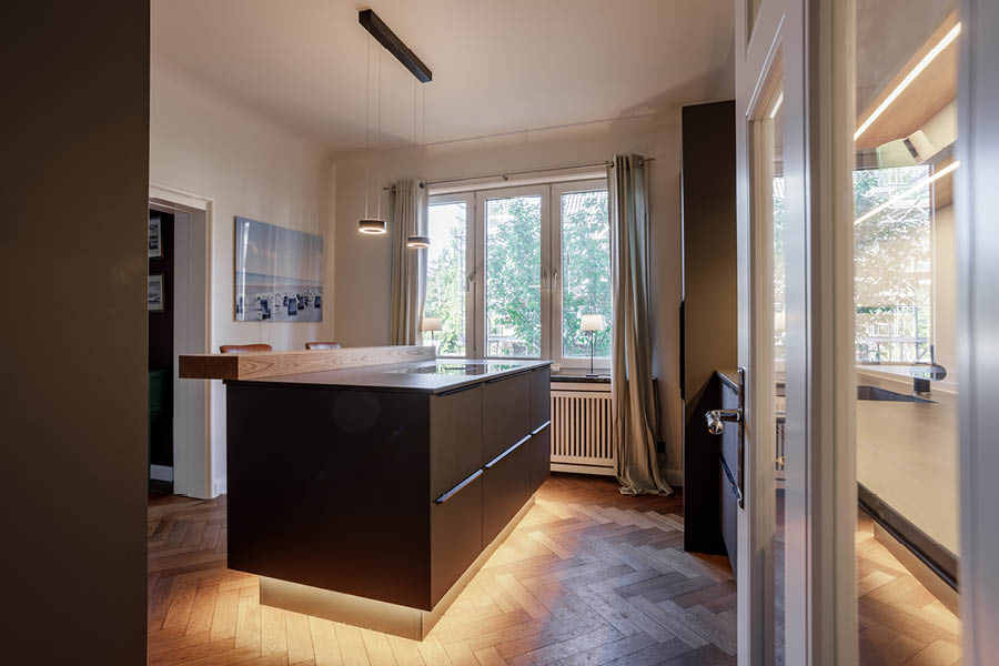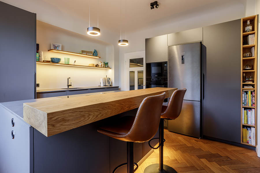 Diese Einbauküche mit Sitztheke in Hamburg-Bergedorf kombiniert matte dunkle Fronten mit einer markanten Holztheke. Der Eichen-Tresen wird dabei schnell zum Lieblingsplatz: für einen Kaffee zwischendurch, Frühstück am Fenster oder lange Gespräche am Abend.