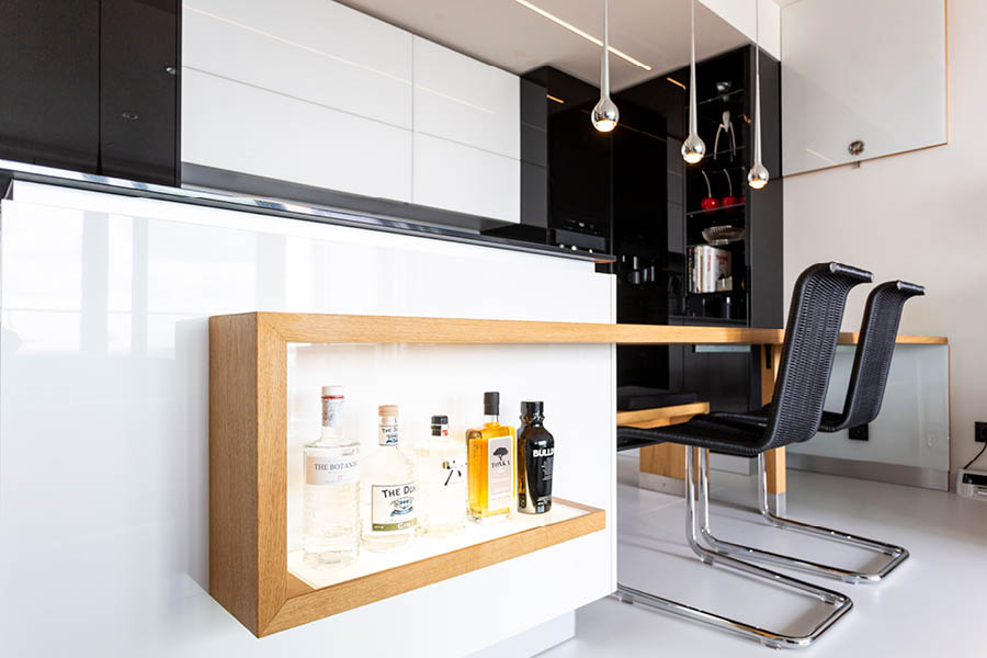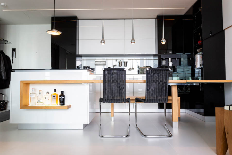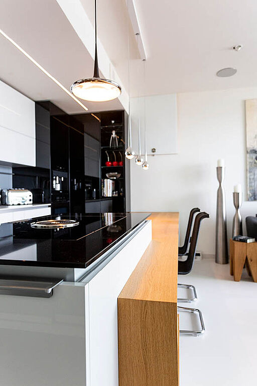 Die Kombination aus schwarzen und weißen Fronten sorgt in dieser Hochglanzküche für eine moderne, kontrastreiche Optik, die gleichzeitig zeitlos bleibt.