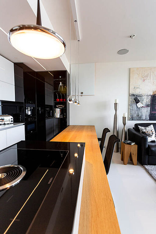 Ausgestattet ist die Küche mit modernster Technik: Ein BORA-Kochfeld mit integrierter und effektiver Dunstabsaugung, die dafür sorgt, dass Kochdünste direkt nach unten abgesaugt werden – so bleibt nicht nur die klare Linienführung erhalten, sondern auch der freie Blick auf den Hamburger Hafen ungestört. Ergänzt wird das Ganze durch hochwertige Miele-Küchengeräte, die dezent in die Hochschränke integriert sind und die elegante Optik unterstreichen.