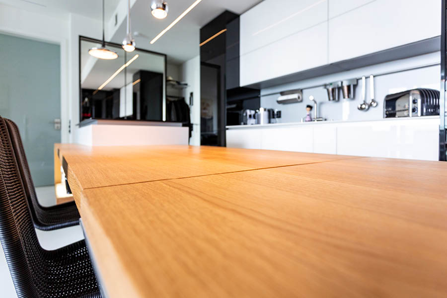 Gleichzeitig setzen Elemente in Holzoptik warme Akzente. Sie schaffen einen natürlichen Gegenpol zu den glänzenden Flächen und verleihen dem Raum eine wohnliche Note.