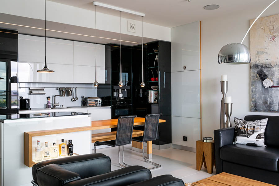Glanzvoll, zeitlos und perfekt inszeniert: Diese Hochglanzküche von der Möbeltischlerei woodendesign verbindet puristische Eleganz mit cleverer Funktionalität. In einem offenen Wohnraum mit Hafenflair setzt sie ein klares Statement – schwarz-weiße Hochglanzfronten, glänzende Oberflächen und eine harmonische Verbindung zu den umliegenden Wohnbereichen.