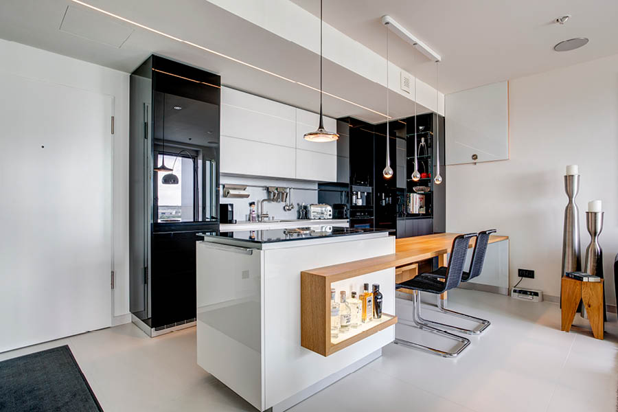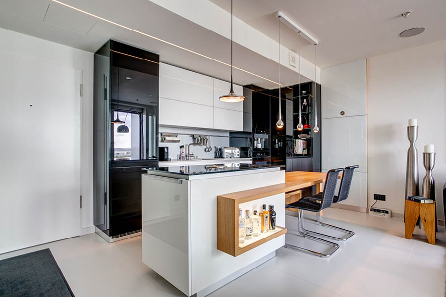 Einen glänzenden Auftritt legt diese clever durchdachte Küche in Schwarz-Weiß-Design hin.